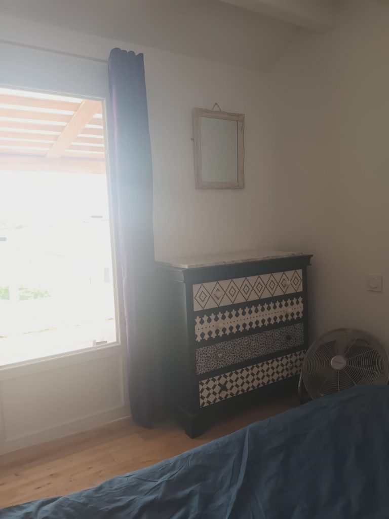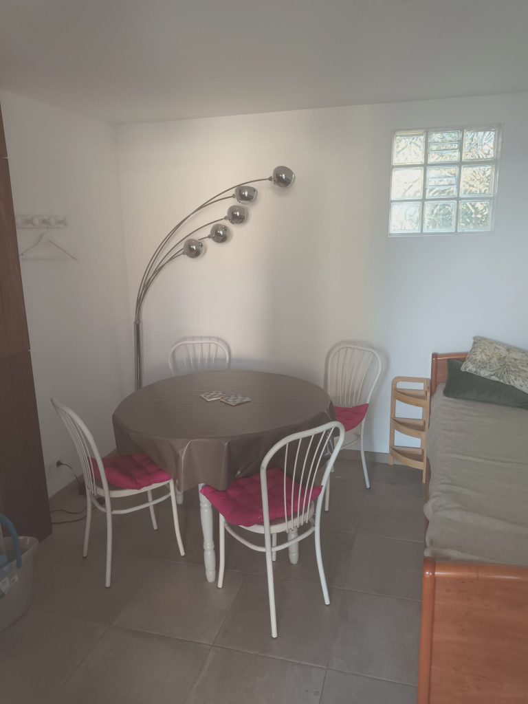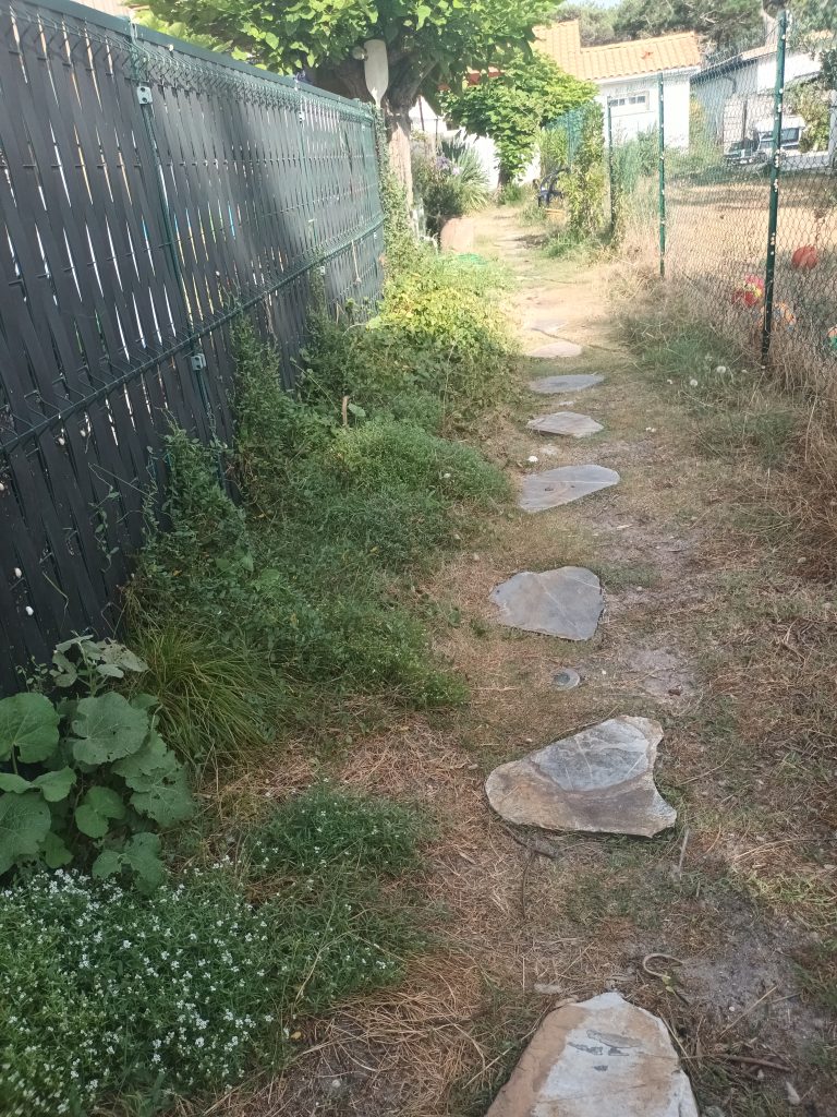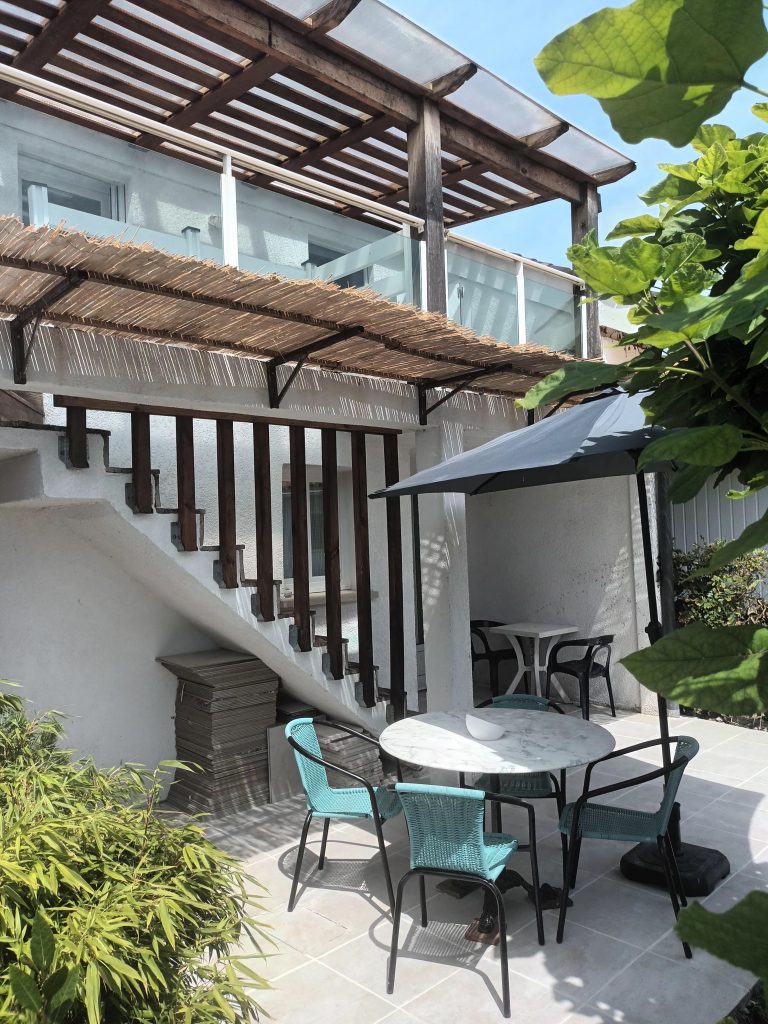 La terrasse en bas est spacieuse. Il y a la table à manger et le parasol, Il y a de la place pour stocker ses vélos et les planches de surf, sous l’escalier.