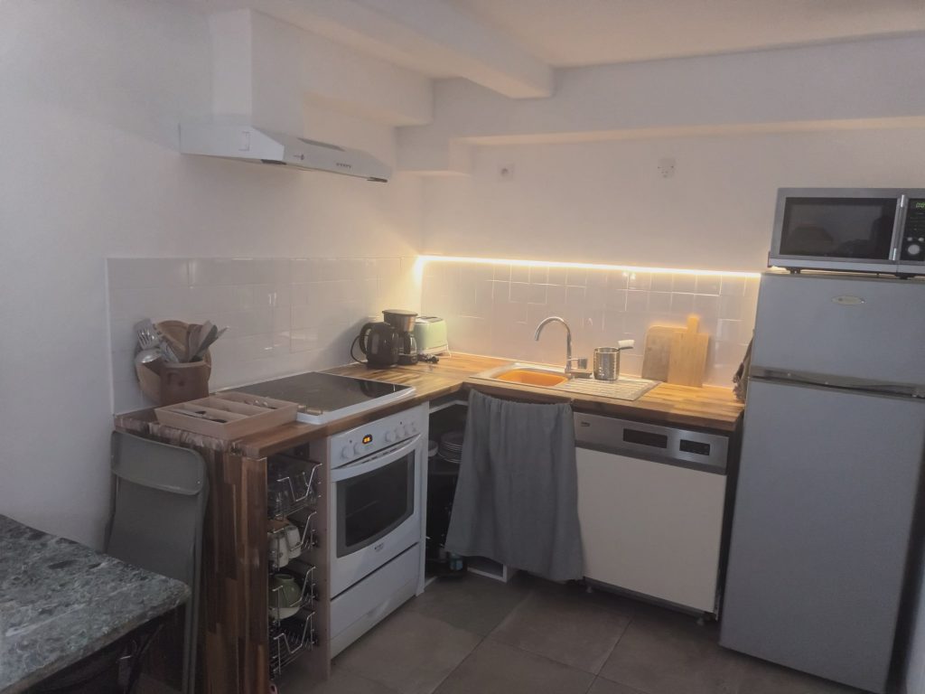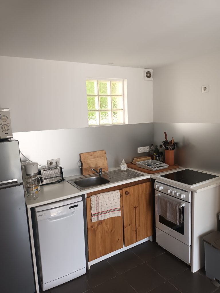Un grand frigo, un lave-vaisselle, une buanderie avec un bon étagère. Un toasteur, une machine à café, et des bons couteaux. Un joli meuble en bois pour la vaisselle, et un large canapé pour se reposer. Un tapis en sisal pour s’étirer, et une table avec ses chaises. La table, on peut en faire un grand ovale, ou la rendre plus petite.